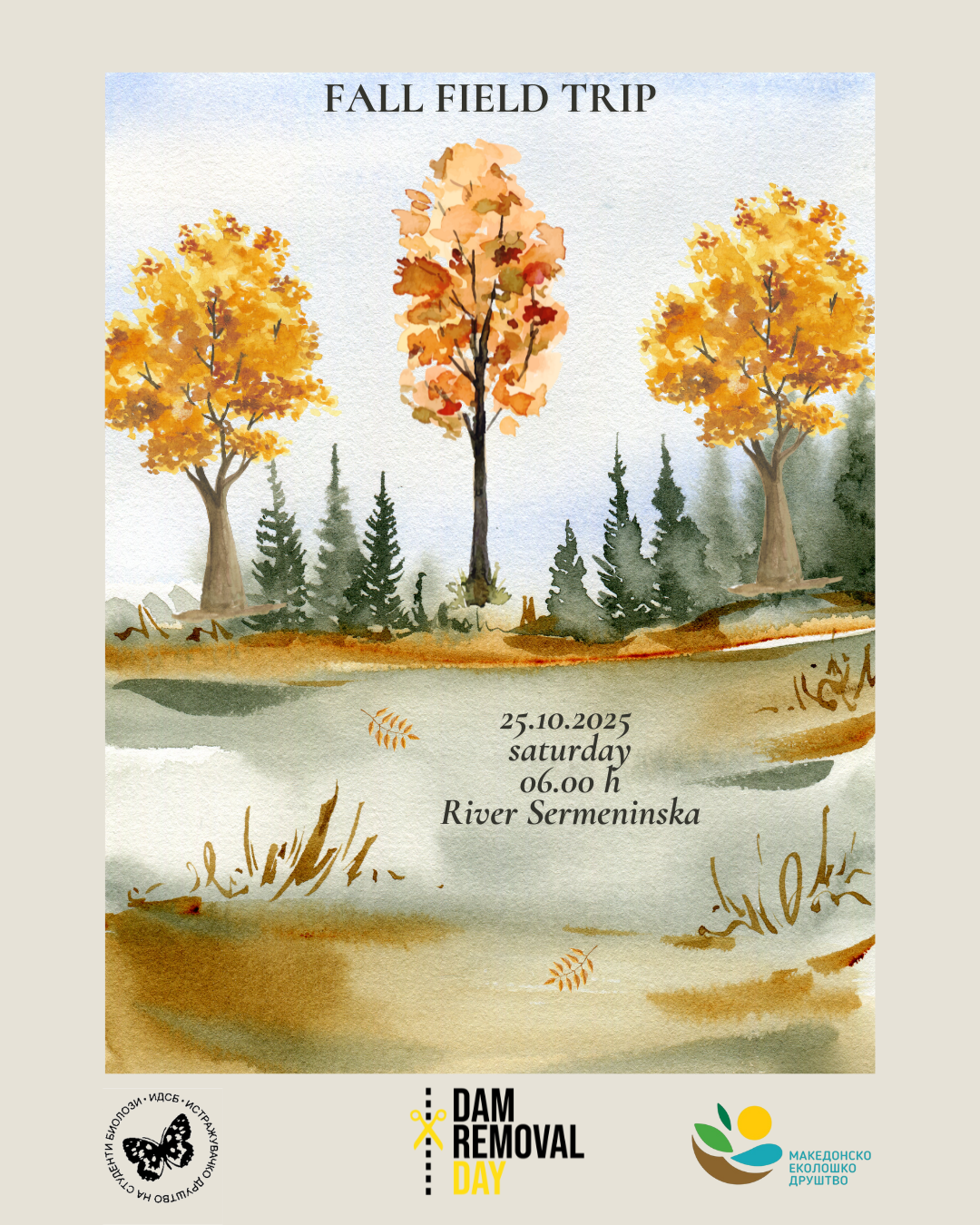 Ве повикуваме на есенски терен на Серменинска Река, во С. Серменин, Гевгелија, по повод Денот на отстранување на браните, организиран во соработка со Македонското еколошко друштво и организацијата Dam Removal Europe, на 25.10.2025 (сабота).